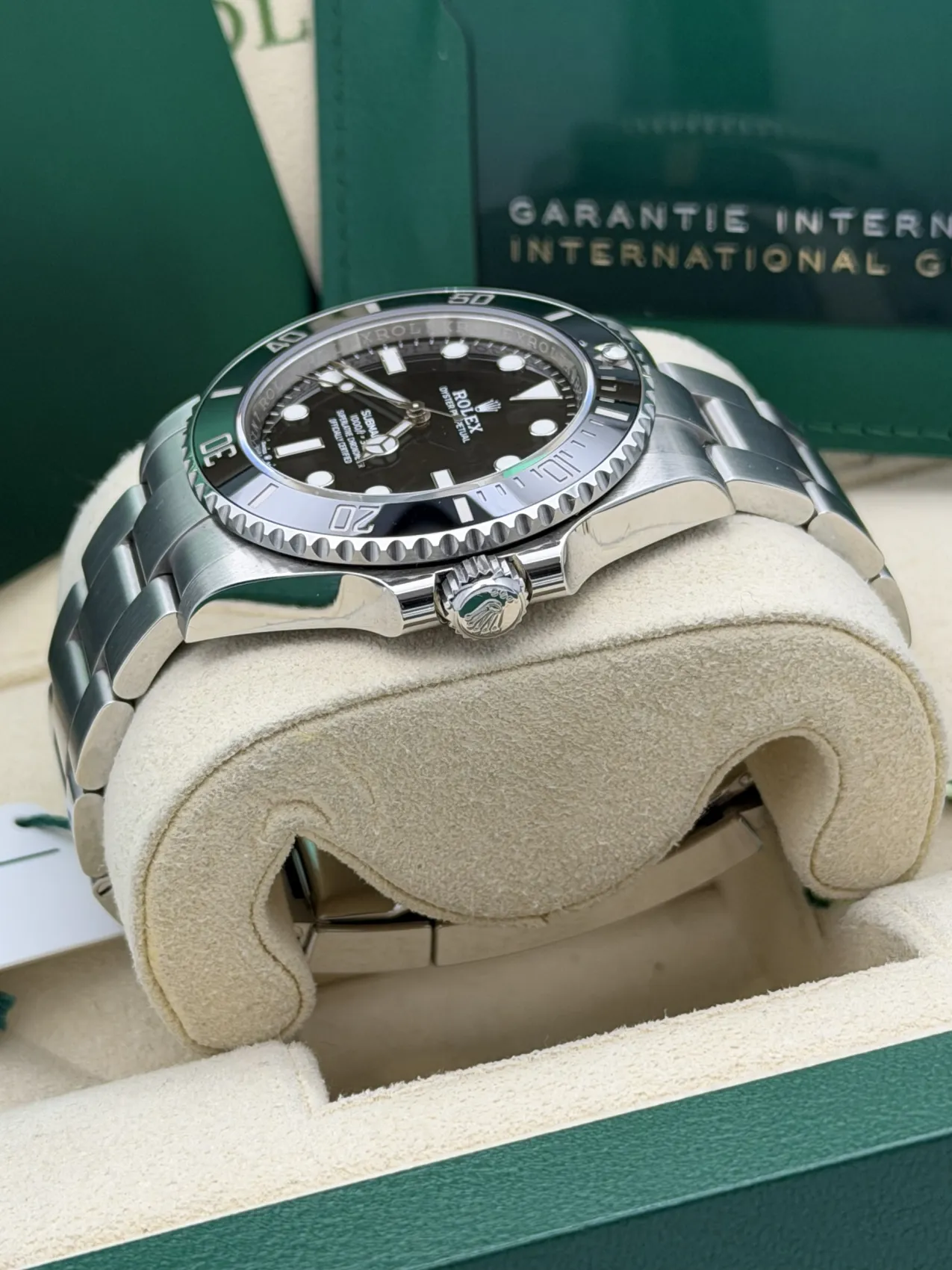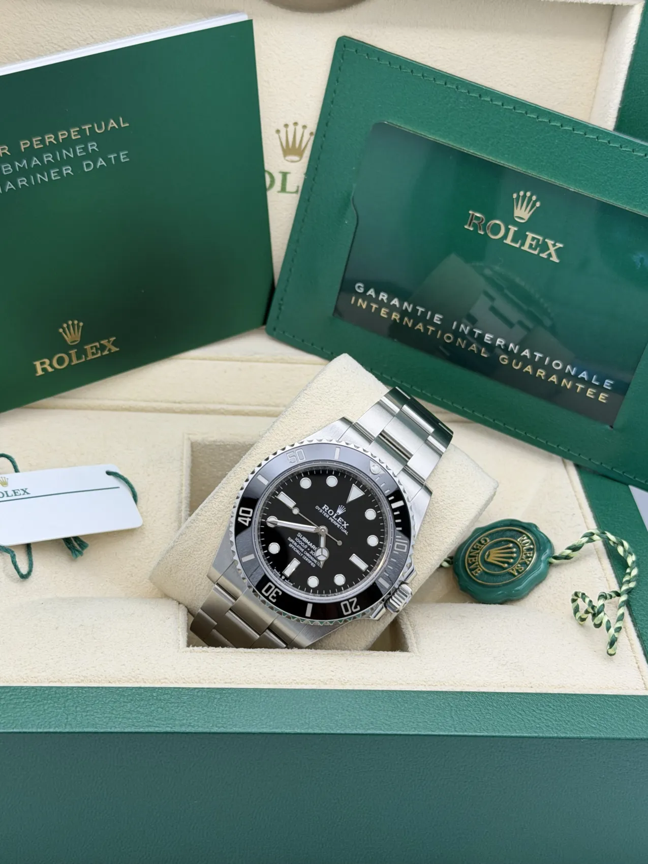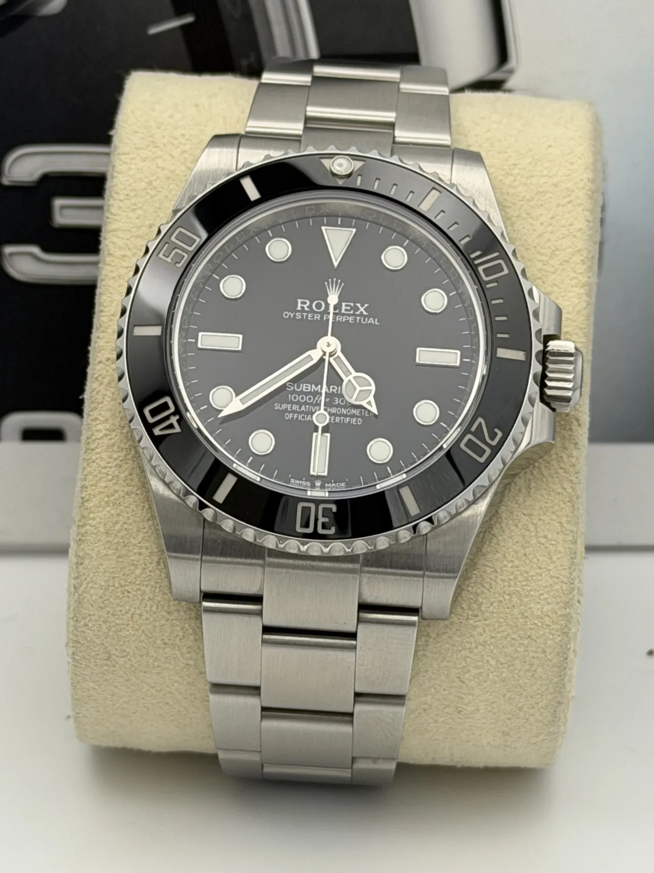 This Rolex Submariner No Date features a 41mm stainless steel case, black Cerachrom bezel, black dial, Oyster bracelet, and the Calibre 3230 automatic movement, offered in excellent condition.