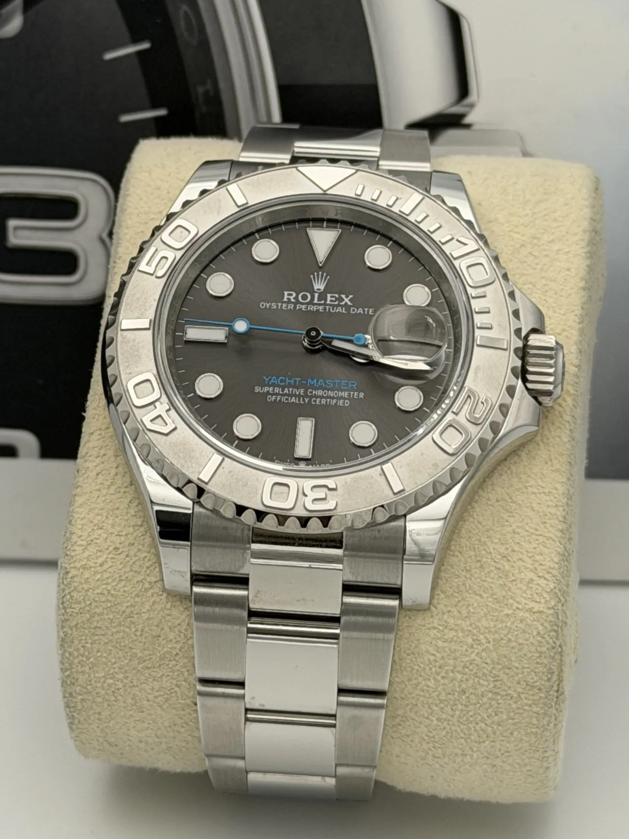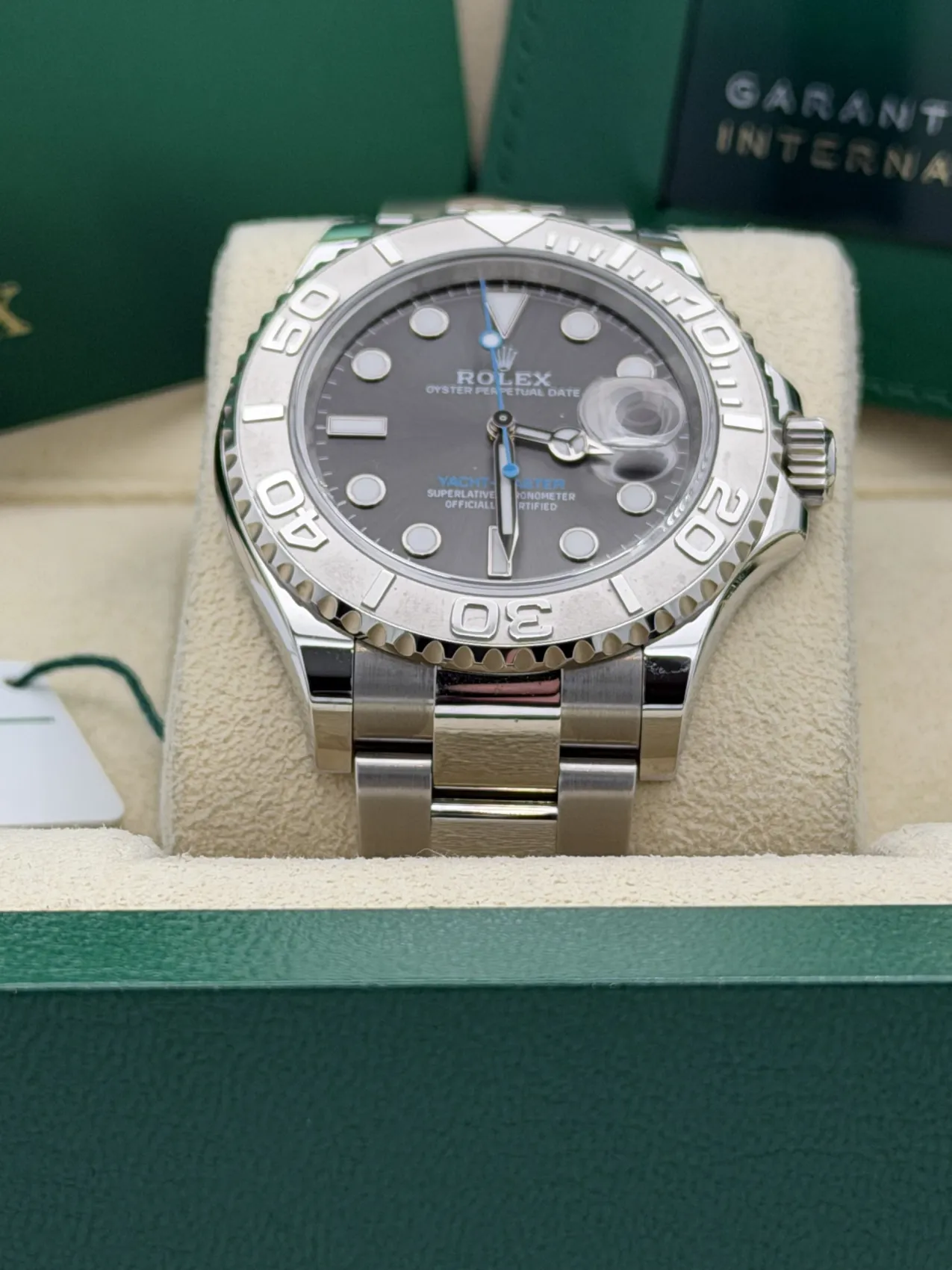 This Rolex Yacht-Master 40mm reference 126622 features a stainless steel case paired with a solid platinum bidirectional rotatable bezel, striking rhodium dial with contrasting baby blue seconds hand and blue “Yacht-Master” text, and the iconic Oyster bracelet with Oysterlock clasp.The 40mm case offers a perfect balance of sport and refinement, powered by the Rolex calibre 3235 automatic movement with Chronergy escapement and approximately 70 hours of power reserve. The sandblasted platinum bezel with raised polished numerals gives the Yacht-Master its distinctive, luxurious character within the Professional range.Presented in unworn 2025 condition, this example offers the latest specification Yacht-Master with full set, making it an exceptional opportunity for collectors or those seeking a premium sports Rolex with everyday versatility.